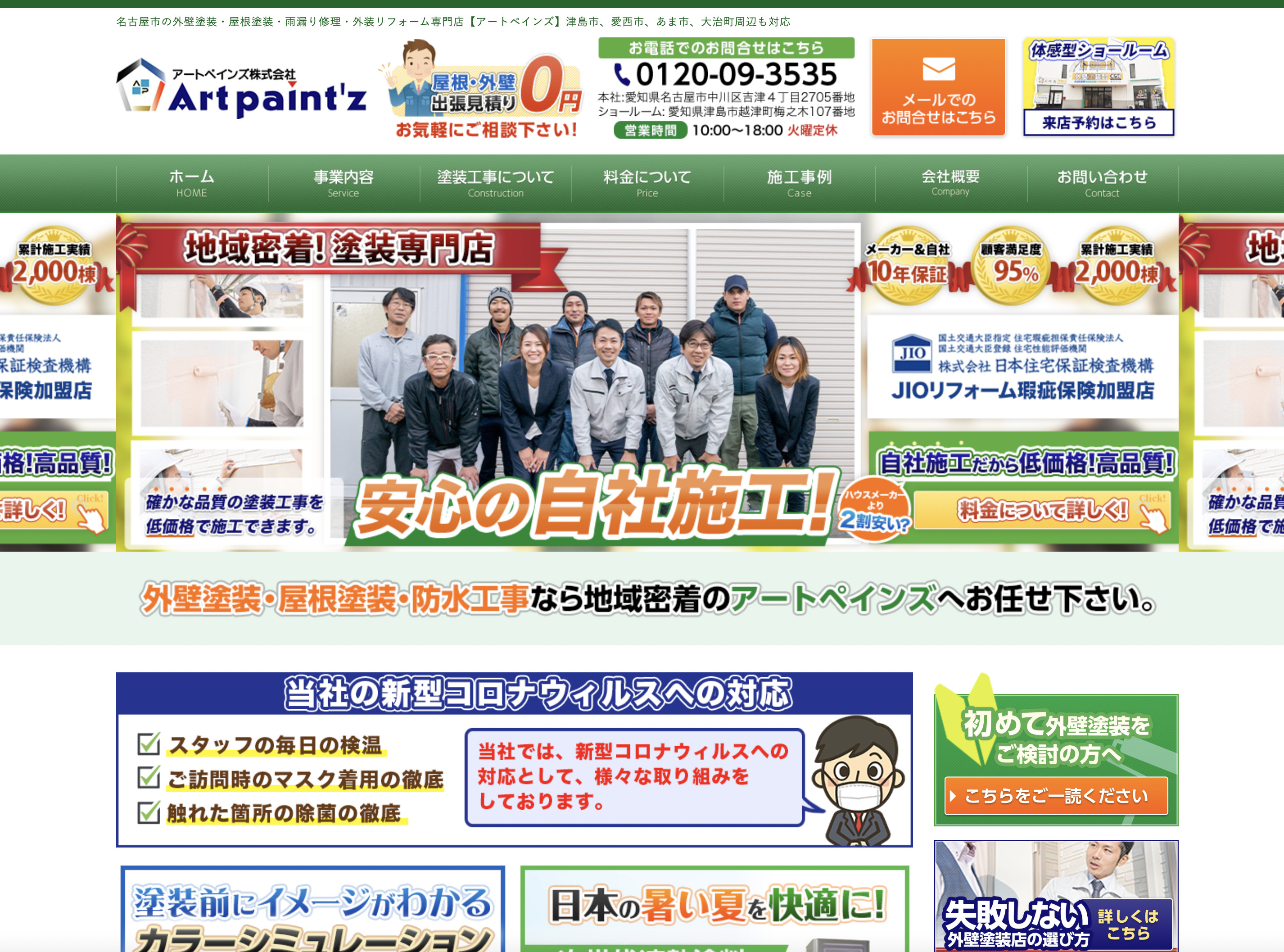 外壁塗装、屋根塗装専門工事店、 アートペインズは、 名古屋市の地域密着の塗装工事店です。地域の皆様のご要望にお応えして、塗料のこと、⼯事内容について、費⽤や⾊、耐久性や施⼯後の保証まで、お客様もお気づきではないところまでしっかりとご提案致します。外壁塗装、屋根塗装を初めてされる方も、以前、失敗された方もお気軽にご相談下さい。地元のお客様に親身に、丁寧に対応することが私たちのポリシーです。