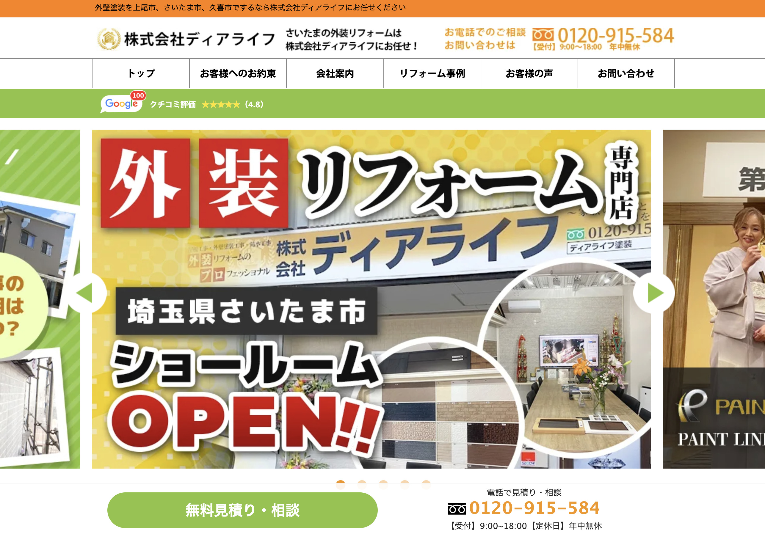 FAX 048-598-5571営業時間 休日 事業内容 外壁塗装/屋根塗装/リフォーム 取得 瑕疵保険 取扱いクレジットカード 取扱いリフォームローン その他 -