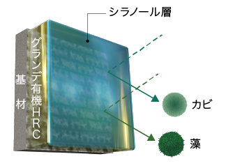 グランデ有機HRCの厚い多重構造無機バリア層は、発生してしまったラジカルをバリア層内に封じ込めラジカルの増殖を抑制し、樹脂に含まれる有機質を守ります。