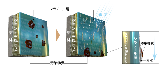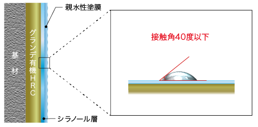 グランデ有機HRCは塗膜の表層にシラノール層を形成することで親水性塗膜となります。