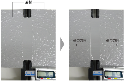 硬性塗膜は0.8mm伸長した際にひび割れが発生。
