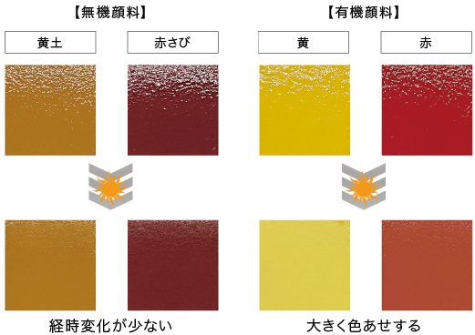 無機顔料に対し有機顔料は耐候性が低く早期退色しやすい。組み合わせた顔料の耐候性により、塗膜は退色・変色に差が生じ、時間の経過に伴いより進行していきます。