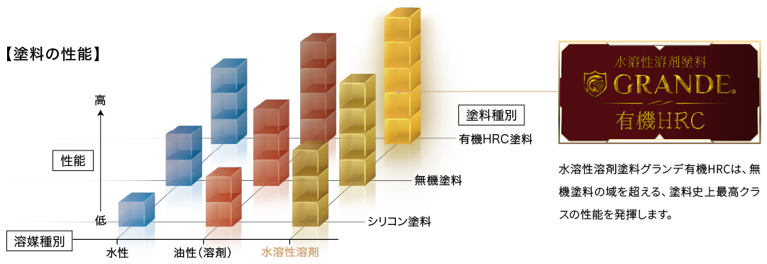 塗料の耐候性は樹脂によって序列化されていますが、使用される溶媒の種別によっても分類し、体系化することができます。塗料本来の潜在能力を余すことなく顕在化させることができる水溶性溶剤。それはあらゆる樹脂の耐候性を、水性塗料や油性塗料では辿り着けなかった新しいステージへと引き上げます。