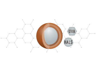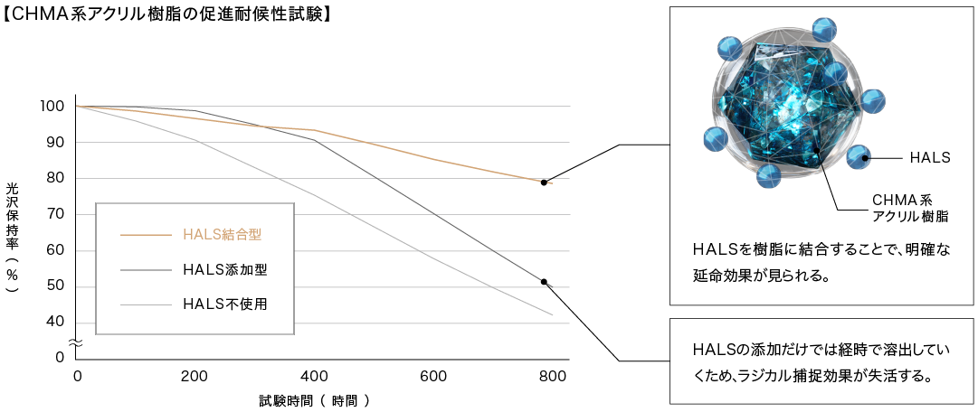 グランデ有機HRCはHALSとUVAの組み合わせ試験を重ね、最大の相乗効果が得られる設計を追究。また、添加しただけではブリード(溶出)しやすいHALSを、耐候性の高いCHMA系アクリル樹脂の骨格中に合成。HALSのラジカル捕捉機能の長期維持を可能にします。
