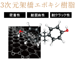 特殊有機複合樹脂があらゆる外力に耐えうる塗膜強度を発現。さらにエポキシ樹脂の3次元網目構造がしなやかさを付与することで靱性の高い塗膜を形成します。