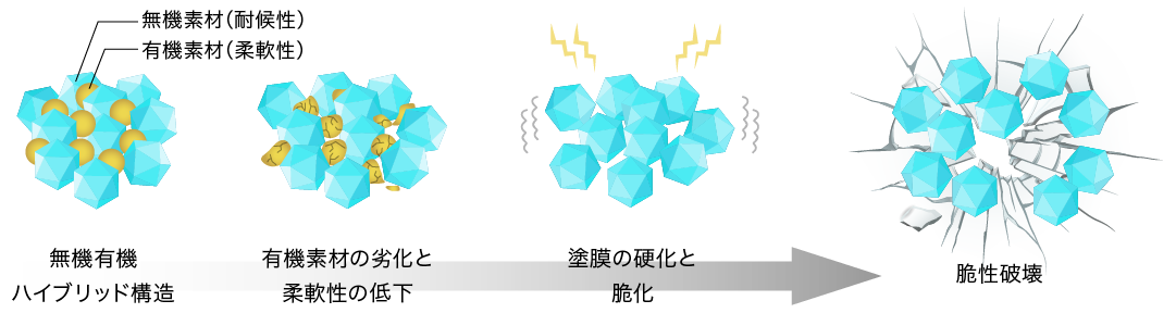 無機塗料は、本来柔軟性に乏しい無機成分に有機成分を架橋させて柔軟性を持たせています。しかしこのハイブリッド構造は、経年とともに有機成分が先に劣化・分解し、塗膜の硬化と脆化が進むという性質も持っています。その結果、塗膜はまるで薄いガラスのように割れやすくなり、 振動や基材の動きといった外的要因によって脆性破壊が生じやすくなります。