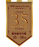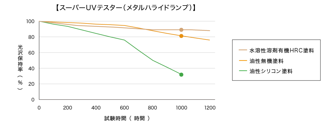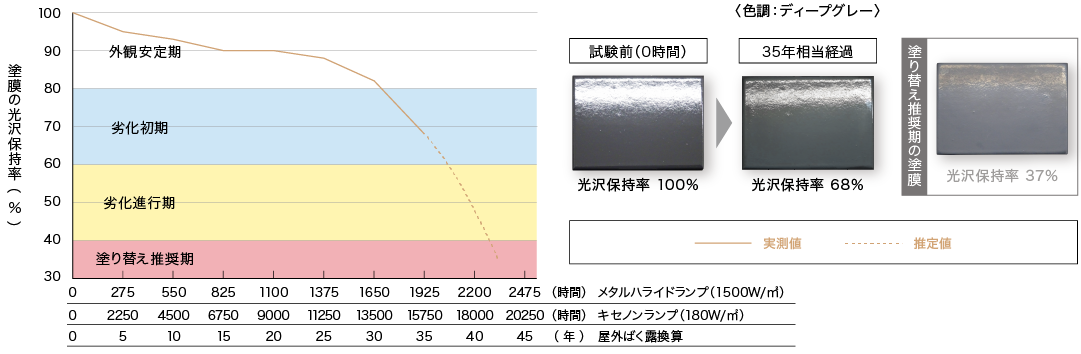 グランデ有機HRCを塗布した試験片で35年相当の促進耐候性試験を行った結果、約30年相当の時点で初期の外観変化が見られ、35年相当を経過した段階で劣化の進行傾向が見られました。他の高耐候塗料と比較しても、その劣化進行は極めて緩やかです。また、屋根や外壁において著しい色あせやチョーキングが発生する塗り替え推奨期(光沢保持率40%未満)までは、まだ十分な耐候性を残していることがわかります。