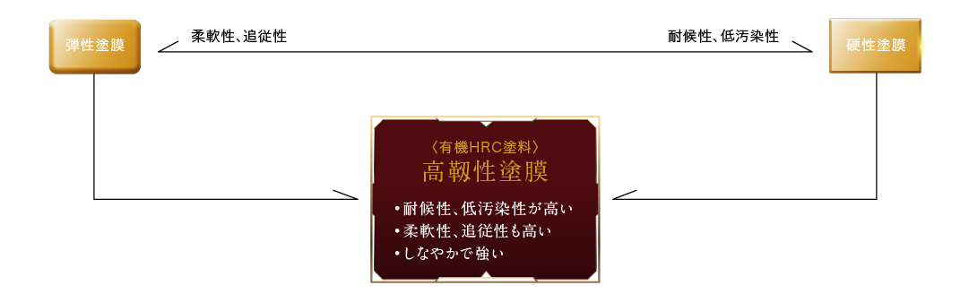 有機HRC塗料の塗膜は、弾性塗料と硬性塗料双方の特長を兼備