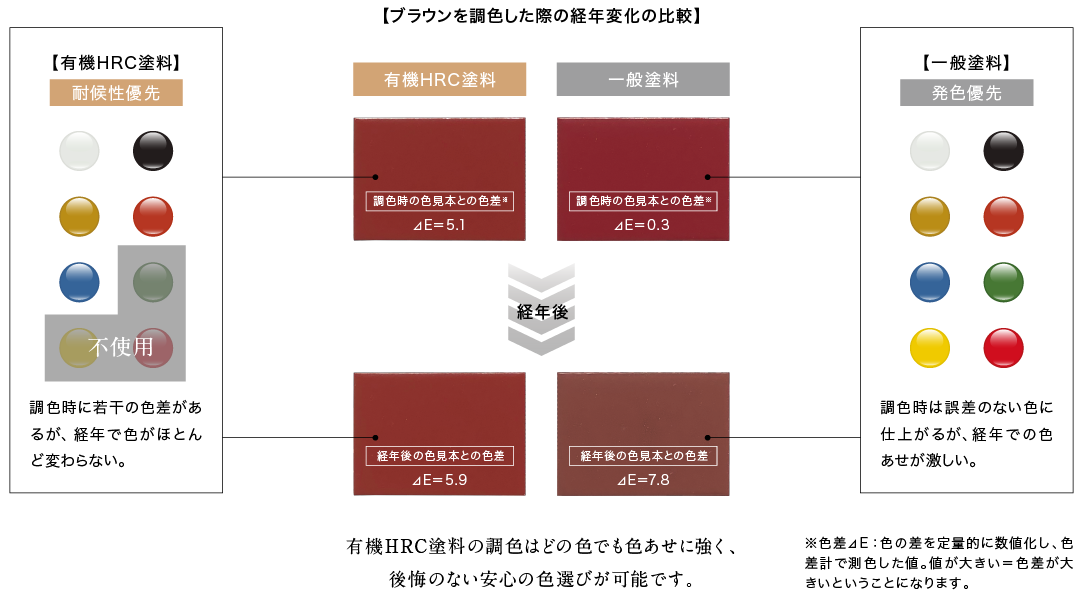 化学的に安定で劣化や色あせに強い無機顔料に対して、有機顔料は早期に色あせします。有機HRC塗料は、最も色あせしやすい黄と赤を全て黄土と赤さびに置き換えて色を表現。