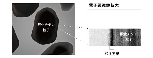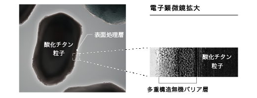 厚い多重構造無機バリア層で酸化チタン(白顔料)の表面をコートして紫外線の侵入を防ぐ。