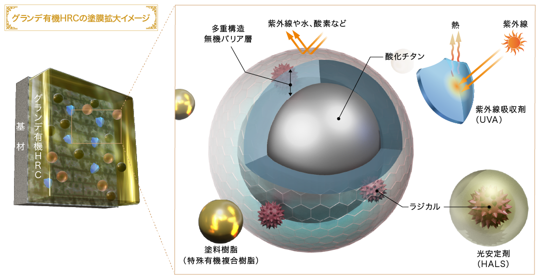 グランデ有機HRCは自動車や重防食などの極めて高い耐候性が求められる分野で使用されている多重ラジカル制御形酸化チタンを、住宅塗装分野において業界に先駆けて採用しました。