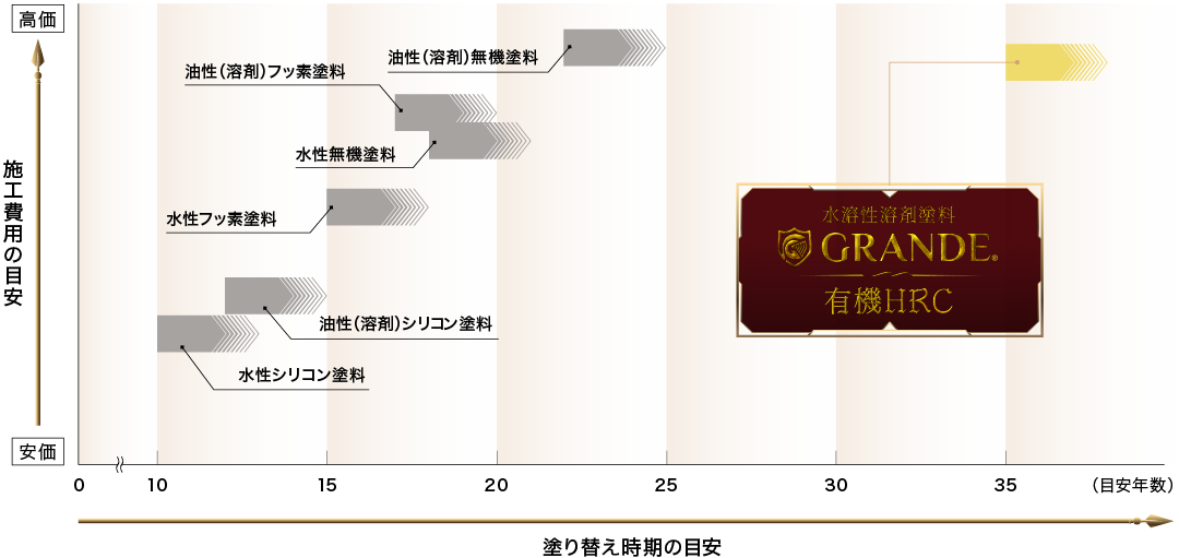 住宅の塗り替えに使用する塗料は種類によって価格や耐候性が異なります。グランデ有機HRCは耐候性が高く塗り替え周期が長いので、長期的にみればライフサイクルコストは低減されます。グランデ有機HRCは無機塗料を上回る優れたコストパフォーマンスと圧倒的なライフサイクルコストの低減をかなえました。