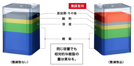 艶消し、半艶(5分艶)などは、艶調整剤を添加することで作られますが、艶調整剤を入れる分、樹脂量の配合率は低下するため、同じ製品であっても艶の違いで樹脂の性能には差が生じます。有機HRC塗料は樹脂の優れた性能を最大限発揮させることを優先した艶あり製品のみのラインナップです。