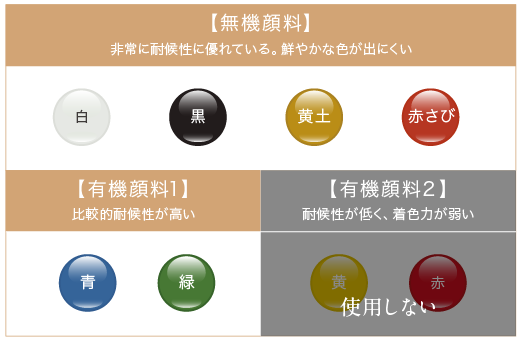 耐候性の低い有機顔料を一切使わず色を表現する顔料調合。化学的に安定性の高い無機顔料調色が長期にわたって塗りたての仕上がりを維持します。