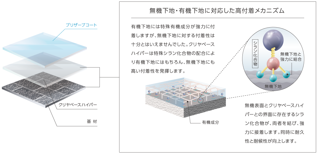 クリヤベースハイパーはあらゆる意匠サイディングに対応した⾼付着プライマーです。今まで不安を感じていた光触媒や無機系などの難付着サイディングに幅広く対応し、さらに剥離のリスク回避に特化することで、プリザーブコートの性能を支えます。