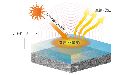 樹脂劣化の直接要因となるUV-A波とUV-B波を効果的に吸収し無害な熱として放散。半永久的にその過程を繰り返します。