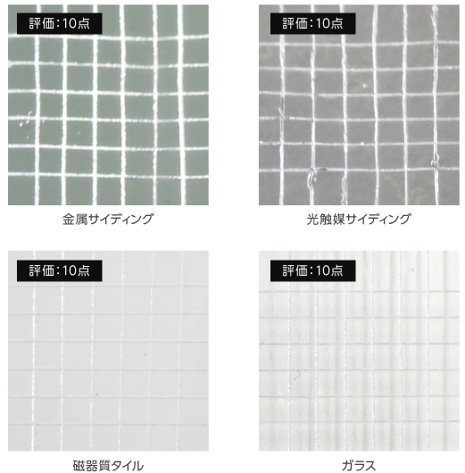 クリヤベースハイパーを併用したプリザーブコートは、上記のようなさまざまな基材に対して付着性試験を繰り返し実施し、すべての対象基材においてその密着性が評価基準中最高評価であることが確認されました。今まで塗装自体が困難と思われた難付着サイディングにも安心して施工することができ、長期にわたってその意匠性を維持することができます。