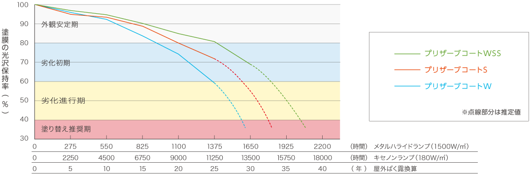 プリザーブコート3製品を塗布した試験片で促進耐候性試験を行った結果、Wで約22年、Sで約25年、WSSで約30年相当を経過した段階で劣化の進行傾向が見られました。極めて著しい艶落ちが発生する塗り替え推奨期(光沢保持率40%未満)までは、まだ十分な耐候性を残していることがわかります。
