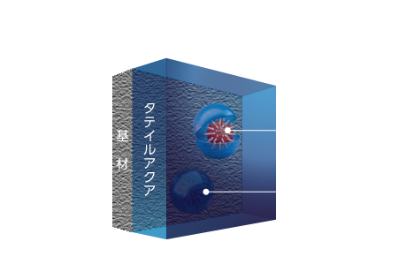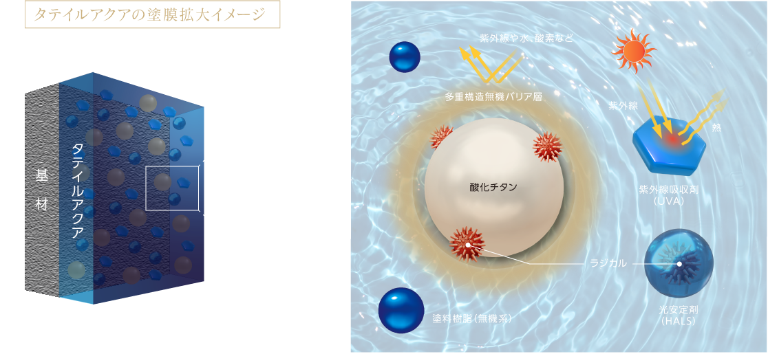 タテイルアクアは自動車や重防食などの極めて高い耐候性が求められる分野で使用されている多重ラジカル制御形酸化チタンを、住宅塗装分野において業界に先駆けて採用しました。