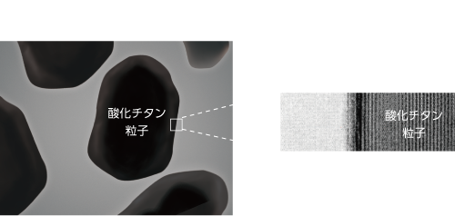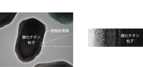 厚い多重構造無機バリア層で酸化チタン(白顔料)の表面をコートして紫外線の侵入を防ぐ。