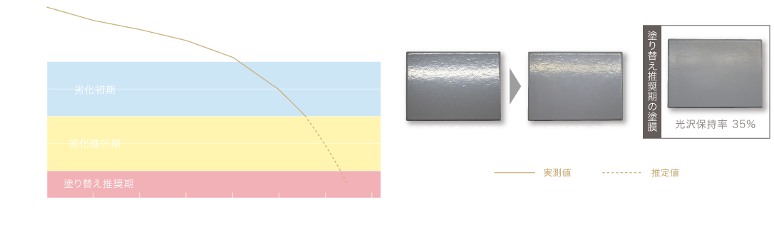 タテイルアクアを塗布した試験片で促進耐候性試験を行った結果、約20年相当を経過した時点で初期の外観変化が見られ、25年相当を超える段階から劣化が進行していくことが確認されました。屋根や外壁において著しい色あせやチョーキングが発生する塗り替え推奨期(光沢保持率40%未満)までは、まだ十分な耐候性を残していることがわかります。