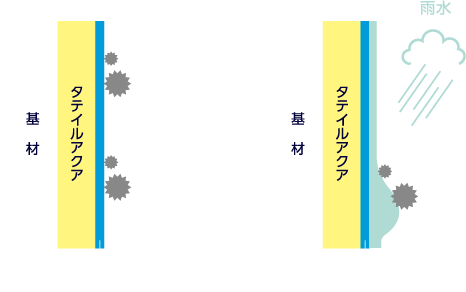 汚染物質と塗膜表面の間に雨水が入り込み、汚染物質を浮き上がらせ、そのまま流し落とします。